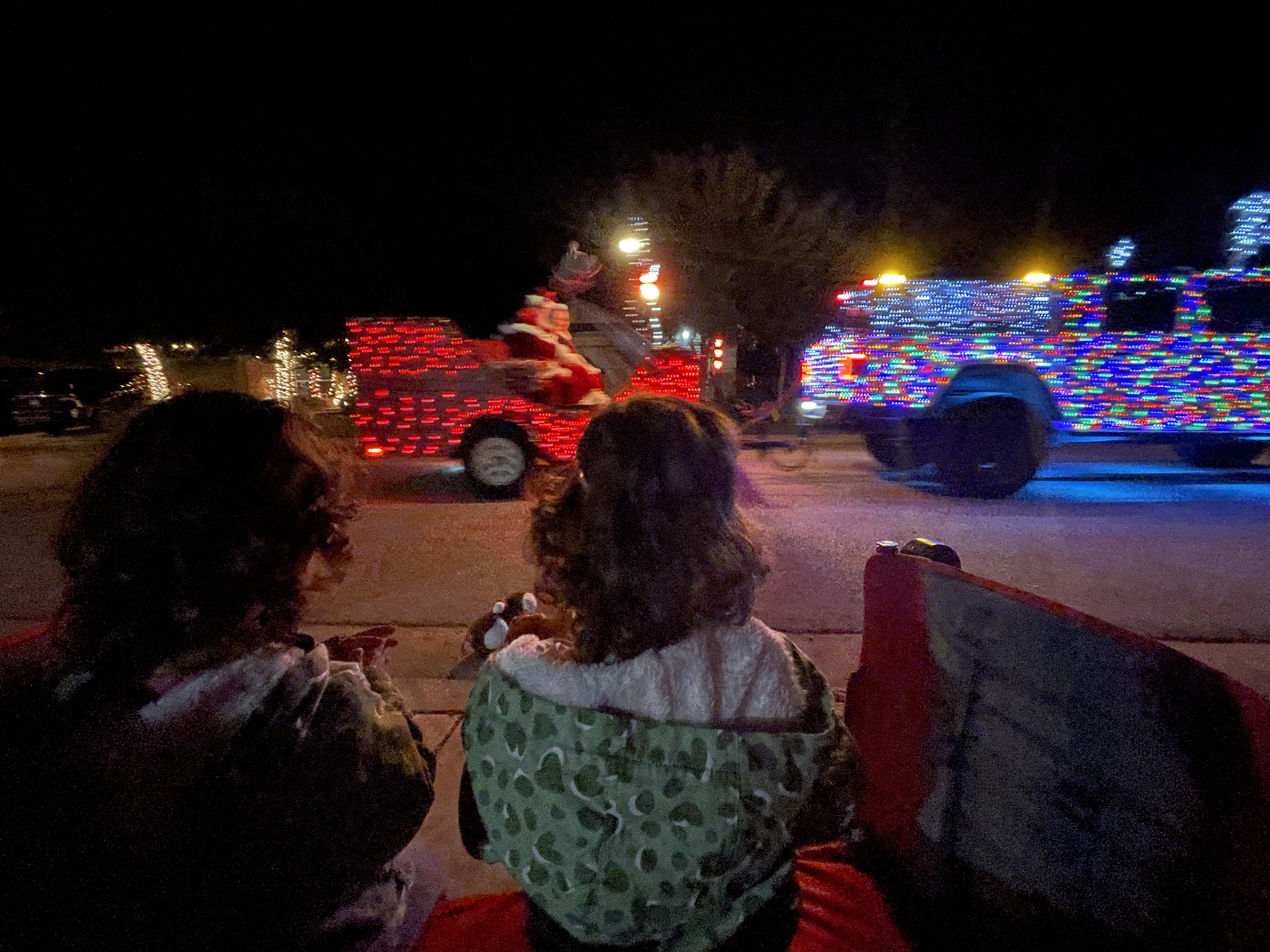 Danny had to work at Dominos tonight. The Jeeps were also scheduled to come through the neighborhood tonight. We first saw them at the parking lot of Dominos where I was picking up some pizzas for dinner. They were waiting around before getting ready for their parade and were willing to take a Santa picture with Addie which was really sweet of them. We left Dominos and pulled over on a quiet street to watch their parade before going back to our home. I figured we would be inside eating dinner by the time they got to our street but the kids wanted to see them again so we set up chairs on our driveway where our neighbors joined us while we ate and watched the parade again. It was a great night to our early Christmas celebration.